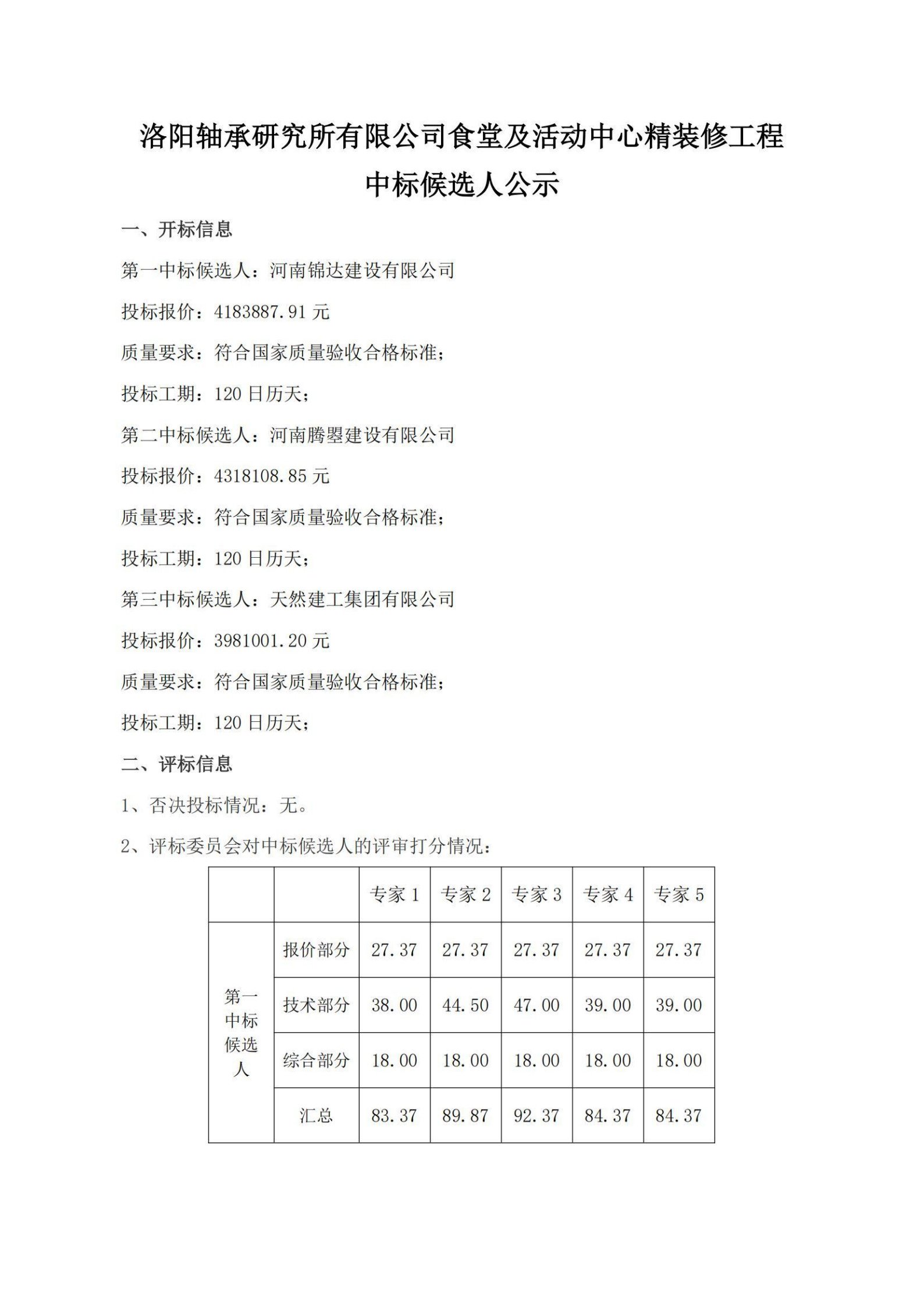 洛陽軸承研究所有限公司食堂及活動中心精裝修工程中標候選人公示