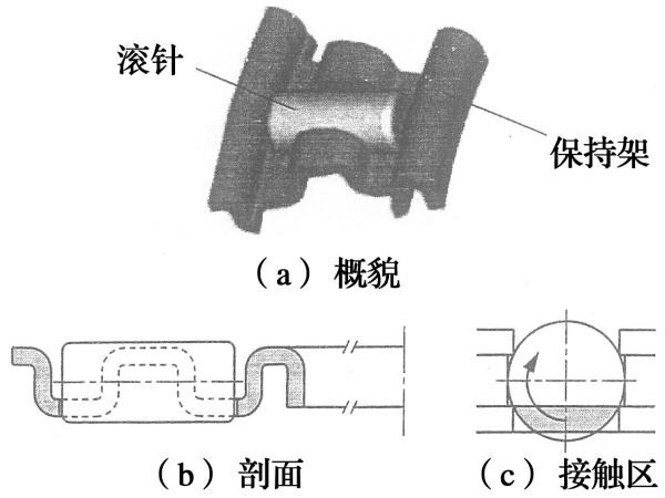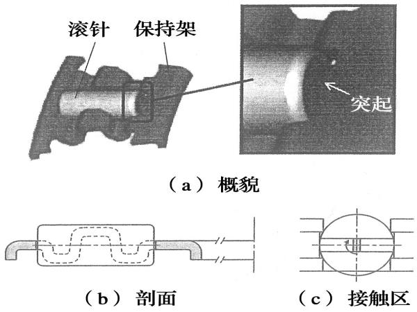 低轉(zhuǎn)矩設(shè)計方案:將滾子端面和保持架兜孔端的接觸處靠近周向速度小的滾子的軸心;通過將保持架兜孔端面設(shè)置突起,減小接觸面積;通過將滾子復(fù)數(shù)排列(對一個保持架兜孔配置2個短滾子)減小了滾子和滾道的周向速度差。從而抑制滑動摩擦,降低軸承轉(zhuǎn)矩(圖4)。