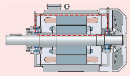 在定子繞組的三相之間,共模干擾產(chǎn)生不對稱電流,圍繞定子周圍的電流總和不為0。圍繞軸的高頻流變化產(chǎn)生了高頻軸電壓。因此,軸向流動的電流很危險,該電流可穿過轉(zhuǎn)子軸、軸承、定子以及后面的其他軸承(圖5)。