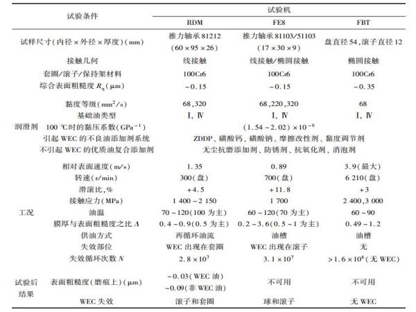 其采用3種試驗(yàn)機(jī),FE8試驗(yàn)機(jī)、改進(jìn)的四球試驗(yàn)機(jī)(FBT)和滾子-盤(pán)試驗(yàn)機(jī)(RDM)進(jìn)行了試驗(yàn),試驗(yàn)機(jī)配置和試驗(yàn)條件見(jiàn)表1。