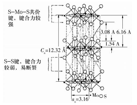 MoS2為具有高度各向異性的六方晶系層狀結(jié)構(gòu),由兩層硫原子和夾在其中的一層鉬原子組成(圖2)。每個(gè)鉬原子被處于三棱柱角上的六個(gè)等距離的硫原子包圍,鉬原子與硫原子層間距離為0.154nm,而硫?qū)娱g的厚度為0.308nm。鉬原子與硫原子以共價(jià)鍵結(jié)合,具有非常強(qiáng)的鍵合力,但硫原子層的層間結(jié)合力非常弱,表現(xiàn)為范德華力。因此,MoS2晶體容易沿范德華力作用區(qū)域劈開,起到潤滑效果。