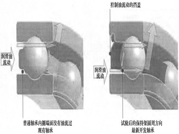 通過(guò)優(yōu)化溝徑尺寸和球徑來(lái)減少球和軸承套圈之間的滑動(dòng)。通過(guò)提高兜孔表面的潤(rùn)滑性和減少球與保持架之間的沖擊力以有效避免兜孔表面的磨損。安裝擋蓋增加潤(rùn)滑油流量;通過(guò)調(diào)整球與保持架兜孔的間隙以及內(nèi)圈外徑與保持架內(nèi)徑的間隙,來(lái)減小球與保持架之間的沖擊力和磨損。