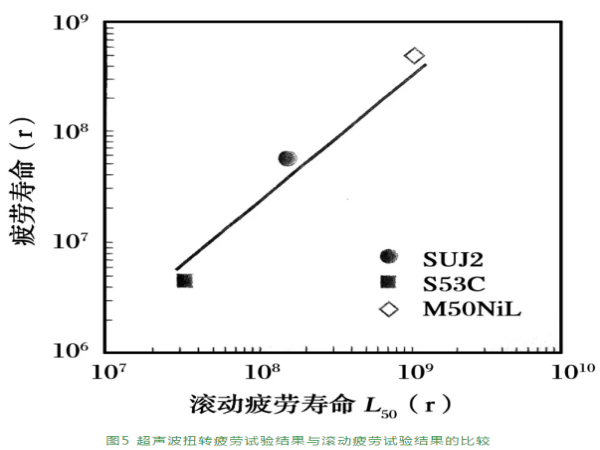 超聲波扭轉(zhuǎn)疲勞試驗機(jī)主要由扭轉(zhuǎn)振動變換器(激振頻率為(20 000±500)Hz)、放大器、扭轉(zhuǎn)振動放大變幅桿等組成。采用本試驗機(jī)評價高碳鉻軸承鋼SUJ2、結(jié)構(gòu)碳鋼S53C、高溫滲碳鋼M50NiL的結(jié)果如圖4所示。根據(jù)時間強(qiáng)度、疲勞極限來評價,那么S53C最低,M50NiL最高。