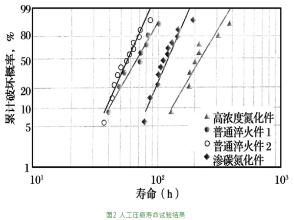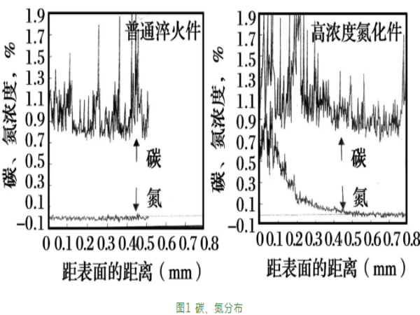 理論和試驗已經(jīng)證明,碳氮共滲處理對軸承的長壽命化有效,特別是對潤滑劑中混入硬質(zhì)異物時對延長壽命更有效。因此,為了使軸承壽命更長,需要開發(fā)更高表面濃度的熱處理技術(shù)。