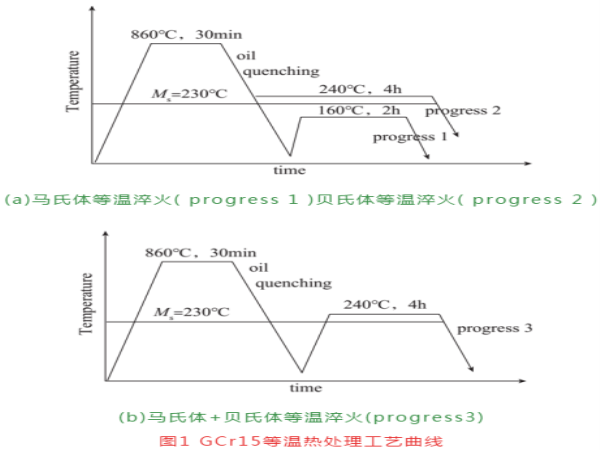 GCr15 軸承鋼具有良好的耐腐蝕性和耐磨性以及較高的抗壓強度,屈服極限為2 000 MPa,熱處理后抗拉強度能夠達(dá)到2250MPa。GCr15軸承鋼常用熱處理方法有4種:第1種為淬火后直接冷卻至室溫,獲得馬氏體組織;第2種為馬氏體等溫淬火,經(jīng)回火后獲得回火馬氏體組織;第3種為貝氏體等溫淬火,獲得貝氏體組織;第4種為馬氏體+貝氏體混合等溫淬火組織,回火后獲得回火馬氏體+貝氏體混合組織。GCr15 鋼等溫?zé)崽幚砉に嚽€見圖1。