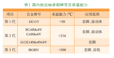 目前國內(nèi)航空軸承的制造和使用仍然以GCr15、8Cr4Mo4V和G13Cr4Mo4Ni4V為主,國內(nèi)軸承鋼的分類和應(yīng)用情況如表1所示。軸承鋼的使用溫度及力學(xué)性能水平?jīng)Q定了軸承鋼的發(fā)展歷程。在使用溫度不高的情況下,主要以GCr15為主,隨著發(fā)動機(jī)推重比的提升,對軸承的強度和承溫能力提出更高的要求。因此,設(shè)計仿制的8Cr4Mo4V鋼應(yīng)運而生,其使用溫度可達(dá)316℃,但是該鋼的沖擊韌性低,為了提高軸承抵抗沖擊的能力,又發(fā)展出了G13Cr4Mo4Ni4V鋼,其使用溫度與8Cr4Mo4V鋼相當(dāng),為滲碳后使用的軸承套圈用鋼,大幅度提高了軸承套圈的耐沖擊能力,但與之相配合的滾動體仍然采用8Cr4Mo4V鋼。隨著軸承制造技術(shù)的改進(jìn)和使用溫度的進(jìn)一步提高,軸承制造結(jié)構(gòu)越來越復(fù)雜,甚至要求軸承和齒輪一體制造,這就需要制造材料既能滿足軸承套圈的使用要求,又能滿足齒輪的使用要求,因此既適用于制造軸承,又適用于制造齒輪的鋼種BG801誕生了。