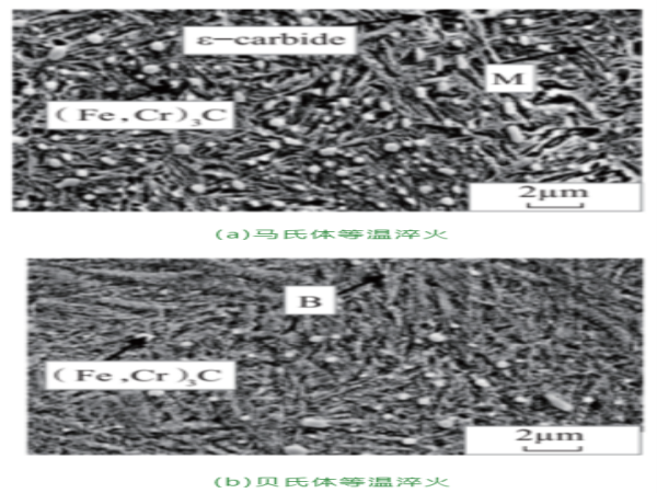 GCr15軸承鋼的貝氏體等溫淬火相較于常規(guī)的淬火+低溫回火,能提高鋼的比例極限、屈服強度抗彎強度和斷面收縮率,具有更高的沖擊韌性和斷裂韌性,尤其適合耐沖擊和潤滑不良的鐵路軸承。獲得3種組織的GCr15鋼的硬度均能滿足軸承使用要求,研究結(jié)果表明下貝氏體的硬度低于馬氏體的硬度,GCr15鋼的硬度隨著馬氏體量的減少和貝氏體量的增加而降低,下貝氏體、下貝氏體+馬氏體復(fù)合組織的強度均高于回火馬氏體。下貝氏體組織、下貝氏體+馬氏體復(fù)合組織的沖擊韌性高于回火馬氏體組織的沖擊韌性。