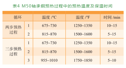 為了獲得最佳的軸承性能,熱處理加熱期間可采用2次或3次預(yù)熱處理,然后進(jìn)行淬火,再進(jìn)行深冷處理或回火處理,回火處理要求冷卻至40℃以下。M50軸承鋼可以在真空爐或氣體保護(hù)爐中進(jìn)行加熱奧氏體化處理,大多數(shù)軸承制造熱處理選擇在中性熔融鹽浴或鹽浴槽中進(jìn)行。零件在奧氏體化前應(yīng)該預(yù)熱,以降低高溫奧氏體化階段的保溫時間。如果采用單級預(yù)熱,預(yù)熱溫度采用815~870℃,保溫時間為5~15min。如果采用多級預(yù)熱,要求的溫度及保溫時間見表4。