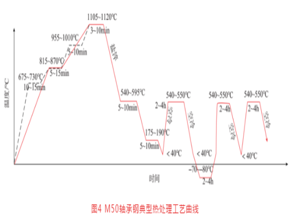 M50軸承鋼需要進(jìn)行多次回火以提供最大硬度,并保持尺寸穩(wěn)定性。零件應(yīng)該進(jìn)行3次或3次以上回火,回火溫度在540~ 550℃之間,時(shí)間為2~4h,每次回火都要冷卻到40℃以下。在第1次回火前或第1次回火后,進(jìn)行深冷處理有利于殘余奧氏體向馬氏體的轉(zhuǎn)變。M50軸承鋼常用的冷處理溫度為-70~-85℃,時(shí)間為2~4h,回火前進(jìn)行深冷處理對(duì)軸承鋼的作用最大。然而,未經(jīng)過等溫處理的零件、容易產(chǎn)生裂紋的零件,不需要進(jìn)行冷處理。當(dāng)零件在回火前進(jìn)行冷處理時(shí),淬火和回火之間的時(shí)間間隔不能超過5h。如果超過5h,之前的應(yīng)力會(huì)釋放,降低了冷處理的有效性。當(dāng)設(shè)備、時(shí)間或零件不具備在回火前進(jìn)行冷處理的條件時(shí),零件應(yīng)該在第1次回火和第2次回火之間進(jìn)行冷處理。根據(jù)國外軸承鋼的熱處理要求,制定出M50鋼的典型熱處理工藝曲線如圖4所示。