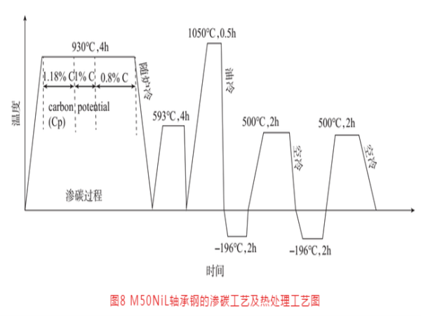 滲碳通常用作G13Cr4Mo4Ni4V鋼的表面硬化,其他表面熱化學(xué)處理,包括氣體等離子滲氮、稀土摻雜和離子注入等也被應(yīng)用于該鋼種。國外M50NiL軸承鋼的熱處理工藝曲線如圖8所示,滲碳后從表面到心部的成分和微觀結(jié)構(gòu)各不相同,碳濃度變化會(huì)導(dǎo)致沿著硬化層深度方向出現(xiàn)多種不同的微觀結(jié)構(gòu)。