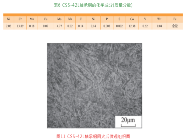 CSS-42L(國內(nèi)牌號(hào)BG801)是航空航天軸承、齒輪用鋼,也是一種高強(qiáng)度不銹鋼,被應(yīng)用于軸承的制備,屬于第3代軸承鋼,具有高強(qiáng)度和良好耐腐蝕性優(yōu)點(diǎn),其化學(xué)成分如表6所示。CSS- 42L軸承零件在885℃條件下進(jìn)行固溶處理lh,氣淬到室溫,然后在-73℃下進(jìn)行冷處理1h,最后在482℃下回火5h后的微觀組織形貌見圖11。
