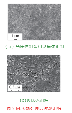 采用這種熱處理工藝獲得的M50軸承鋼的微觀組織如圖5所示。淬火后鋼中的組織主要為馬氏體+貝氏體,經(jīng)回火處理后得到回火馬氏體+下貝氏體,回火后已經(jīng)看不到馬氏體的基本特征,總體表現(xiàn)為回火索氏體組織,并分布有少量竹葉片狀貝氏體組織。