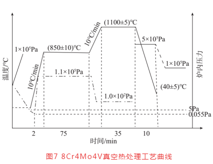 軸承套圈國內(nèi)現(xiàn)有主流熱處理工藝為真空淬火+回火,采用的真空氣淬熱處理工藝見圖7。采用真空氣淬熱處理工藝對(duì)8Cr4Mo4V鋼制軸承零件進(jìn)行熱處理后,硬度、組織均可達(dá)到技術(shù)要求,表面質(zhì)量優(yōu)良,可省去酸洗、清理等工序,節(jié)省部分磨削時(shí)間,經(jīng)濟(jì)效益顯著,同時(shí)可以提高軸承的使用壽命,但真空熱處理仍然存在一定的缺點(diǎn)和不足,有待進(jìn)一步改進(jìn)。