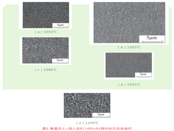 8Cr4Mo4V軸承鋼可以通過等溫淬火獲得貝氏體+馬氏體組織,等溫淬火后貝氏體含量比國外熱處理工藝獲得的貝氏體含量稍高。8Cr4Mo4V軸承鋼中貝氏體形貌與固溶加熱溫度之間存在明顯關(guān)系,分別加熱至1050℃、1065℃、1080℃、1095℃和1110℃,保溫1h后淬入260℃鹽浴爐中等溫處理8h,然后進(jìn)行3次550℃×2.5h回火,獲得的貝氏體組織如圖6所示。當(dāng)固溶溫度較低為1050℃和1065℃時(shí),獲得的貝氏體細(xì)小;而等溫淬火溫度較高為1095℃和1110℃時(shí),獲得的貝氏體尺寸較大。
