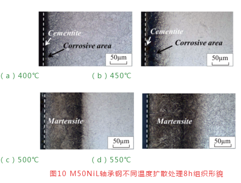 等離子滲碳是一種等離子輔助表面熱處理工藝,它可以促進(jìn)碳在鋼表面的擴(kuò)散,形成碳化物,可以提高軸承鋼表面的強(qiáng)度和耐磨性。M50NiL軸承鋼經(jīng)過等離子滲碳表面處理以后,表面硬度大、心部韌性好,滿足飛機(jī)發(fā)動(dòng)機(jī)部件在惡劣環(huán)境中的使用要求。等離子滲碳處理后,將M50NiL軸承鋼在1050℃下固溶處理1h,進(jìn)行氣體淬火。部分研究表明等離子滲碳過程中的擴(kuò)散動(dòng)力學(xué)的臨界溫度450~500℃之間。因此,將試樣分別在440℃、450℃、500℃、550℃下處理4h、8h及12h后,試樣隨爐冷卻到室溫的微觀組織形貌見圖10,可以看出滲碳溫度越高滲碳層越厚,表面層微觀結(jié)構(gòu)越均勻。滲碳溫度在400~450℃之間時(shí)表面層結(jié)構(gòu)為滲碳體,當(dāng)溫度處在500~550℃之間時(shí)表面層結(jié)構(gòu)為馬氏體。與未經(jīng)過等離子滲碳處理的軸承鋼試樣相比,經(jīng)過等離子滲碳處理的軸承鋼試樣表面硬度更高。在400℃和450℃下熱處理后的軸承鋼試樣硬度和彈性模量高于500℃和550℃熱處理后的軸承鋼試樣硬度和彈性模量,這是因?yàn)樾纬闪溯^硬的Fe3C相。