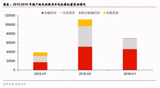 由于我國(guó)稀土資源豐富,因此電動(dòng)乘用車多采用功率性能高、體積較小的永磁同步電機(jī)。根據(jù)中國(guó)汽車工業(yè)協(xié)會(huì)統(tǒng)計(jì)數(shù)據(jù),2016年上半年,我國(guó)純電動(dòng)汽車產(chǎn)銷量分別達(dá)到13.4萬輛、12.6萬輛,同比分別增長(zhǎng)160.8%、161.6%。上半年生產(chǎn)純電動(dòng)乘用車約70000輛,其中永磁同步電機(jī)的裝機(jī)占比約為65.7%,比2015年同期增長(zhǎng)21.25個(gè)百分點(diǎn),比2015年全年增長(zhǎng)了19.99個(gè)百分點(diǎn)。同期,國(guó)產(chǎn)新能源乘用車用交流異步電機(jī)的市場(chǎng)分額在逐漸減小,從2015年上半年的35.1%下滑至2016年上半年年的32.9%;而混合勵(lì)磁同步電機(jī)的占比則從0.03%上升至1.10%。