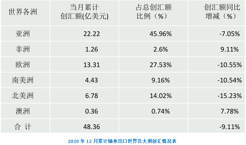 截止2020年12月份,共累計(jì)出口創(chuàng)匯.48.34億美元,累計(jì)創(chuàng)匯比去年同期下降9.14%,較上個(gè)月的-10.83%收窄了1.69個(gè)百分點(diǎn)。出口軸承58.81億套,比去年同期下降0.1%,較上個(gè)月的-2.05%收窄了1.95個(gè)百分點(diǎn);