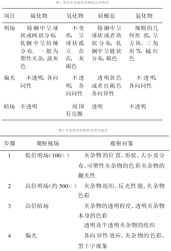 金相法鑒定夾雜物是根據(jù)夾雜物的形貌、分布及其在明場、暗場和偏光下的光學(xué)特征(表1),與已知的夾雜物特征對照以確定其類型。必要時(shí)可以測定夾雜物的顯微硬度或經(jīng)受化學(xué)試劑腐蝕的能力。非金屬夾雜物的金相法鑒定步驟見表2。