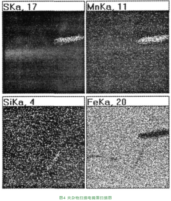 在金相觀察中選出待定夾雜物后,用電子探險(xiǎn)針(EPMA)進(jìn)行微區(qū)成分分析或者應(yīng)用掃描電鏡(SEM)自帶能譜分析(EDS)進(jìn)行成分分析。通??梢詼y定尺寸大于1μm的夾雜物的組成元素和大致成分,如果采用個(gè)別元素的面掃描還可以得到更為直觀的結(jié)果。圖4是使用掃描電鏡對Q460鋼中的一顆夾雜物進(jìn)行的面分析圖譜,依次進(jìn)行硫、錳、硅和鐵四種元素的面掃描,從掃描結(jié)果可以推斷出,明場觀察中夾雜物為MnS、SiO2和FeS,通過能譜儀(EDS)對其進(jìn)行成分分析,還可直接得到各元素的質(zhì)量分?jǐn)?shù)。