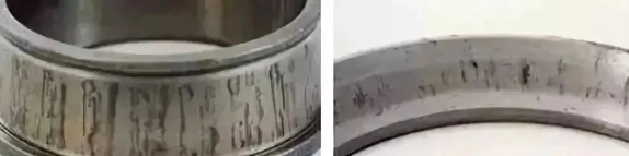 當(dāng)軸承內(nèi)圈強(qiáng)制套入軸頸后,輕者將使?jié)L道底部產(chǎn)生嚴(yán)重磨損的環(huán)形軌跡,重者在滑道內(nèi)、外圈和滾珠上均會(huì)有裂口或剝皮。