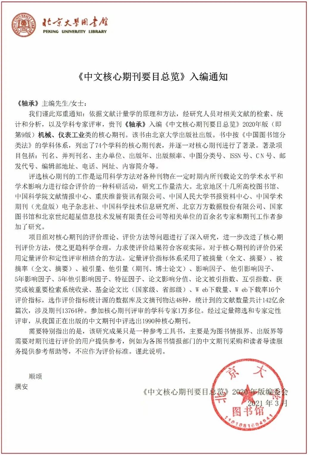 3月11日,《軸承》編輯部收到北京大學(xué)圖書館《中文核心期刊要目總覽》編委會通知,《軸承》入編《中文核心期刊要目總覽》2020年版(第9版)之“機械、儀表工業(yè)類”的核心期刊。這也是《軸承》連續(xù)第9次入編《中文核心期刊要目總覽》。