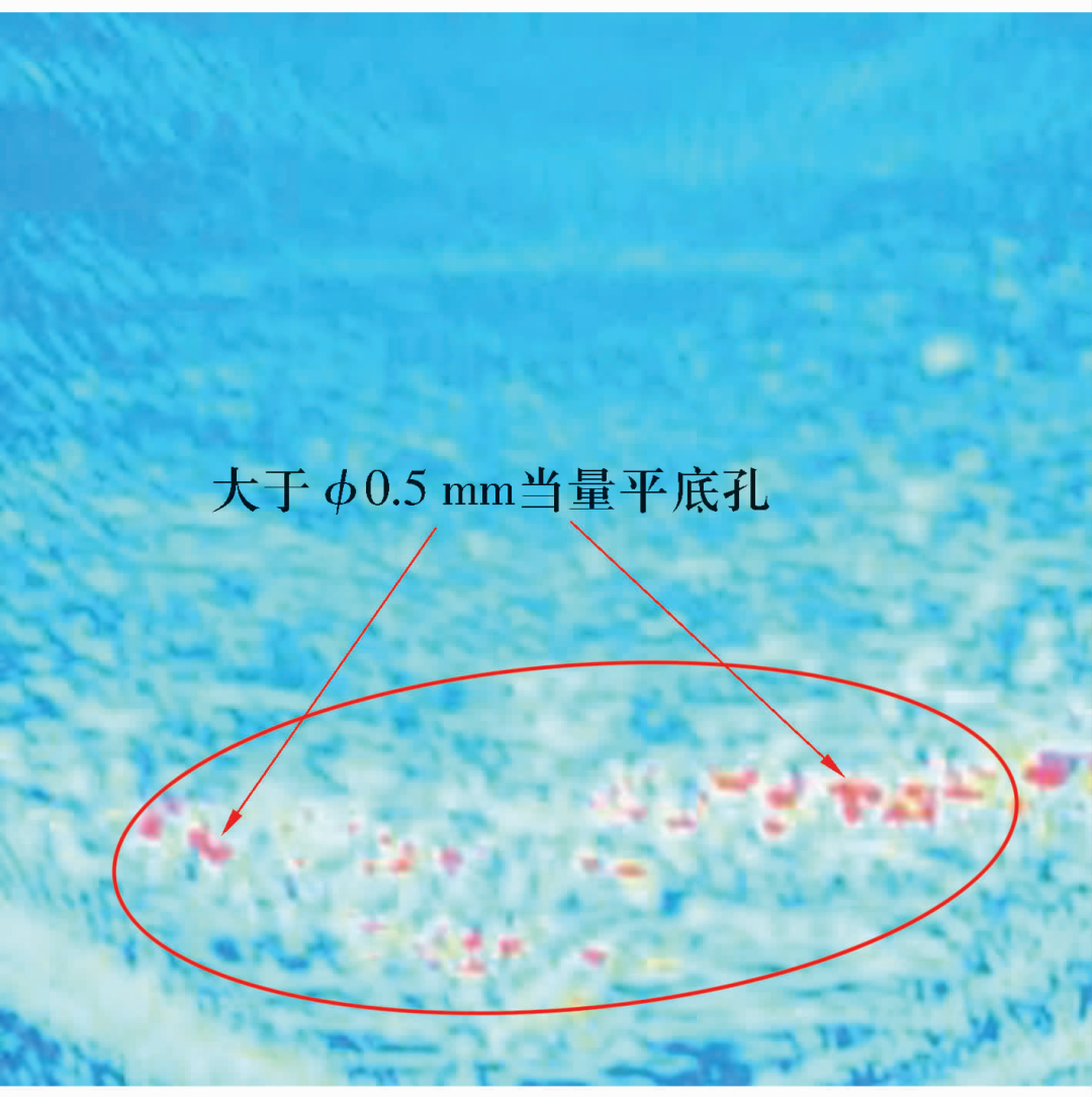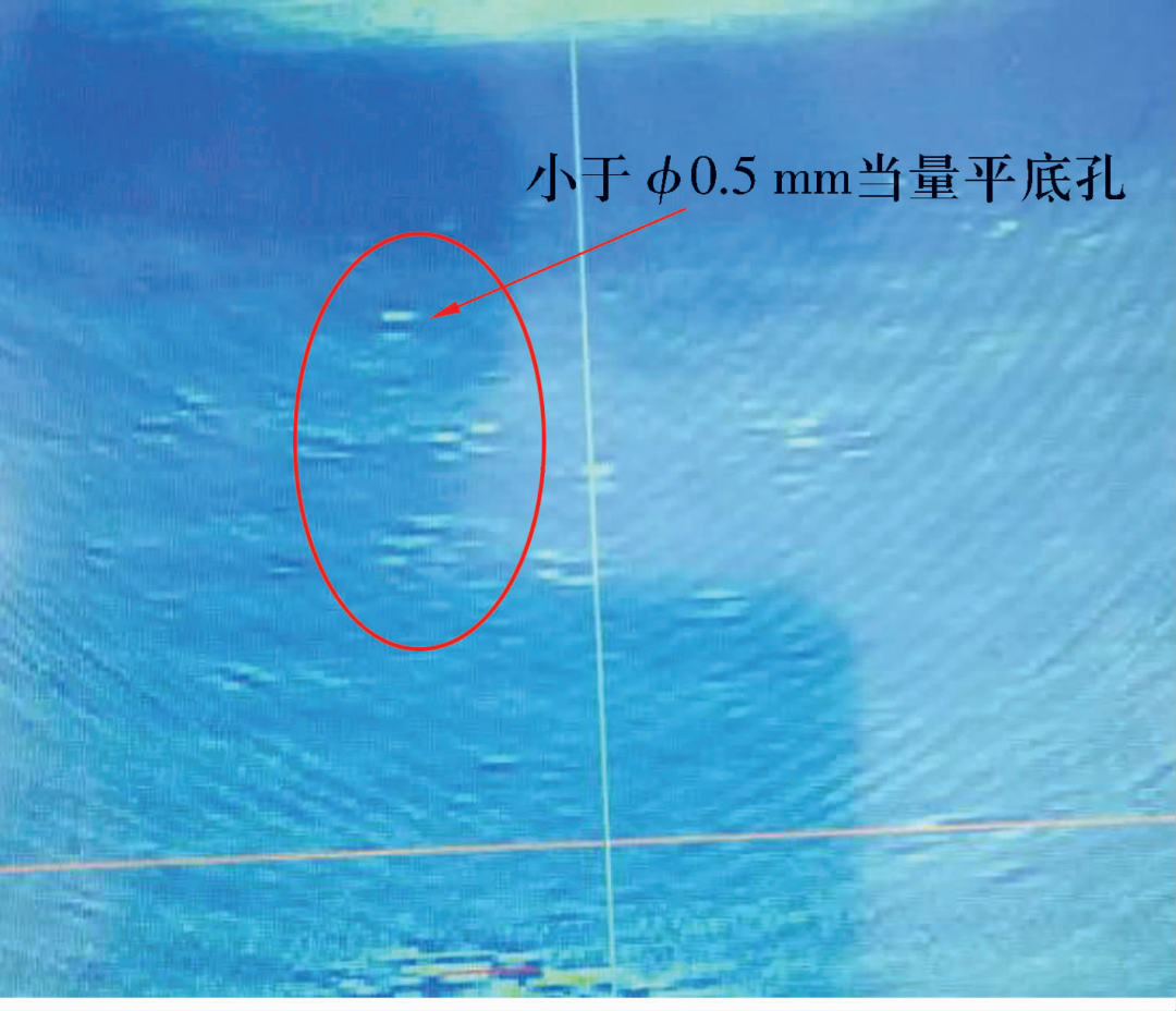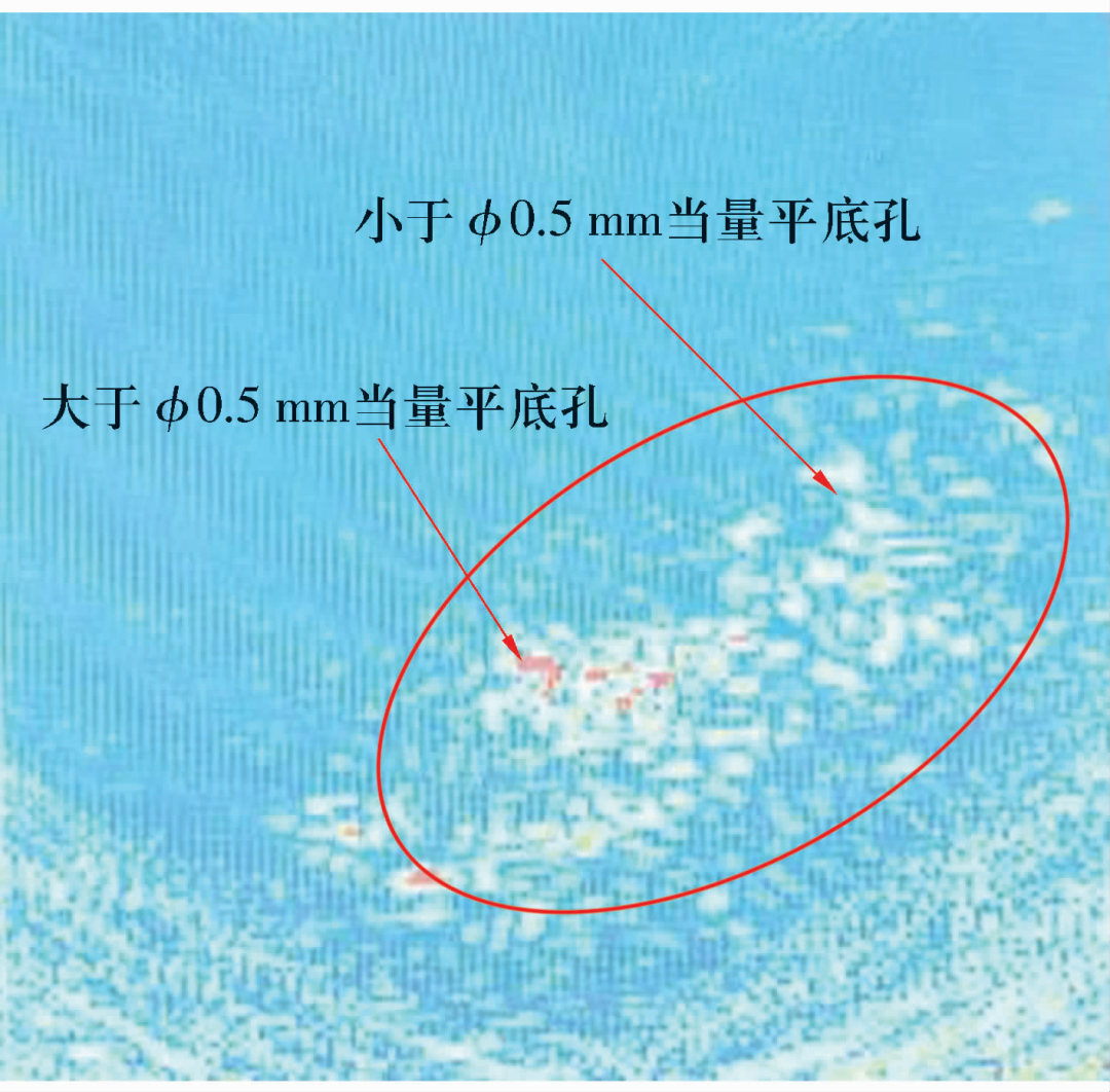 采用對(duì)比試塊法,考慮到內(nèi)部過(guò)燒缺陷常常體積較小,從單個(gè)缺陷定量和密集型缺陷定量?jī)煞矫婵紤],綜合實(shí)踐經(jīng)驗(yàn),級(jí)別定為φ0.5 mm當(dāng)量平底孔。