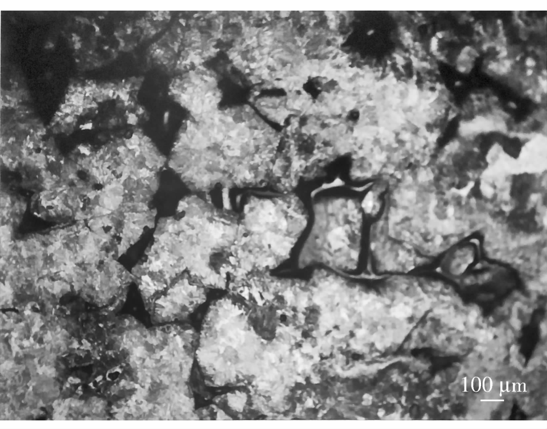 金相檢驗(yàn)是控制軸承零件內(nèi)在質(zhì)量的重要手段,包括宏觀檢驗(yàn)與微觀檢驗(yàn)。某軸承滾子100倍過(guò)燒顯微金相圖像如圖2所示,過(guò)燒組織晶粒異常粗大,整個(gè)晶界層燒熔,在三角晶界處出現(xiàn)明顯的燒熔孔洞,呈黑色晶界網(wǎng)絡(luò)。