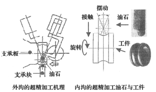 圖4為球軸承的超精加工示意圖。超精加工是將粒度細小的油石壓在旋轉(zhuǎn)的工件上(如內(nèi)、外圈),與工件旋轉(zhuǎn)呈直角方向上給予微小的擺動,精加工工件表面。至于球軸承溝道的超精加工,是以溝R中心為油石擺動中心,進行加工。此外,開始時,使用適應于工件形狀的油石,由于并不實施油石的修整,利用由于油石磨耗導致的油石自銳作用,一邊維持油石形狀,一邊持續(xù)進行加工。