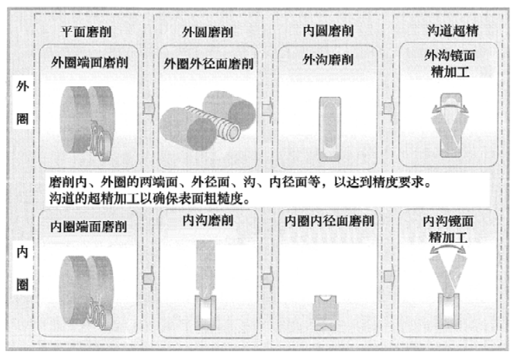 經(jīng)塑性加工及切削加工,完成成形加工的工件,實施熱處理之后,首先,用雙端面磨床磨削基準端面。然后用縱向進給貫穿無心磨床磨削外圈外徑面,可連續(xù)加工。之后,以外圈端面外徑面為基準,進行外圈溝道磨削和超精。同樣,內(nèi)圈要進行內(nèi)溝磨削、內(nèi)徑面磨削、內(nèi)溝超精。然后提交給裝配、檢查工序。