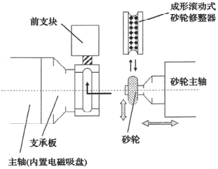 為實現(xiàn)圓弧狀的R形溝,要將砂輪成形為R形狀(砂輪修整),復制并加工出該形狀。R形修整中,有以下方法:復制預先制作出了其R形狀的成形滾動式砂輪修整器形狀;與旋轉(zhuǎn)單一金剛石修整工具進行修整的方法。