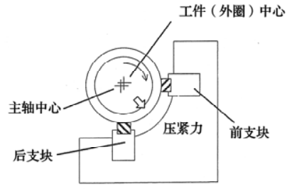 圖3為支承塊無心磨削示意圖。用支承塊分別支承已在磨削中的外徑面或內(nèi)溝,用電磁力將端面吸附到稱為支承板的夾具上,在主軸旋轉(zhuǎn)驅(qū)動的狀態(tài)下磨削外溝或內(nèi)徑面。主軸中心與用支承塊支承的工件(外圈)中產(chǎn)生偏心,利用由于偏心與旋轉(zhuǎn)產(chǎn)生的推壓力,工件穩(wěn)定地在支承塊上旋轉(zhuǎn)。外徑與外溝可按恒定壁厚加工,能夠得到規(guī)定的溝與外徑的同心度與溝圓度。