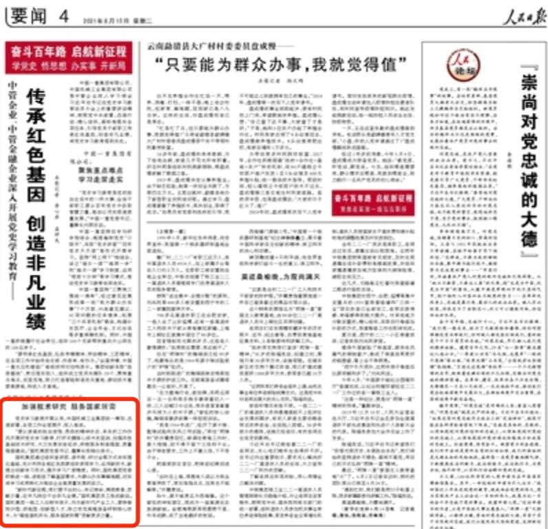 黨史學(xué)習(xí)教育開展以來(lái),國(guó)機(jī)集團(tuán)統(tǒng)一籌劃、迅速部署,高標(biāo)準(zhǔn)落實(shí)各項(xiàng)任務(wù),并把黨史學(xué)習(xí)教育同總結(jié)經(jīng)驗(yàn)、觀照現(xiàn)實(shí)、推動(dòng)工作相結(jié)合,與推進(jìn)企業(yè)改革發(fā)展相結(jié)合,取得一系列實(shí)踐成果,把學(xué)黨史、悟思想、辦實(shí)事、開新局落到實(shí)處。6月15日,《人民日?qǐng)?bào)》在要聞版報(bào)道了集團(tuán)黨史學(xué)習(xí)教育的相關(guān)工作。