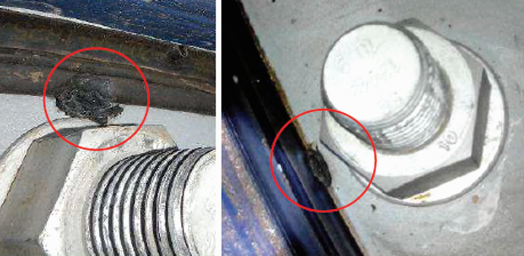 風(fēng)電機(jī)組的葉片安裝或維護(hù)時(shí)需要使用液壓拉伸器對(duì)葉片與變槳軸承的連接螺栓施加力矩,連接螺栓與密封圈的距離較近,且液壓拉伸器的拉伸頭外形尺寸較大,拉伸頭易壓到密封圈使密封圈嚴(yán)重破損,如圖2所示。變槳軸承后續(xù)運(yùn)行時(shí)可能會(huì)導(dǎo)致密封圈變形和撕裂,造成潤滑脂大量泄漏。