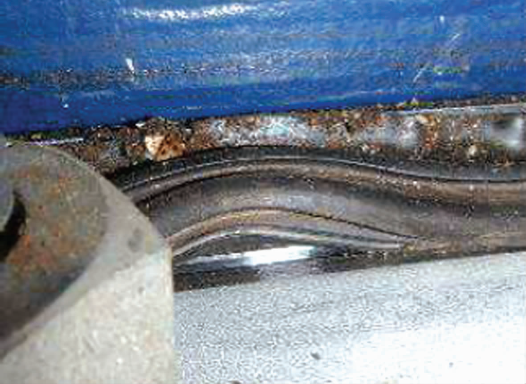 不按照工藝安裝或維護(hù)時(shí)會(huì)導(dǎo)致密封圈受力不均勻,安裝密封圈時(shí)接口粘接不良會(huì)導(dǎo)致密封圈接口斷裂,后續(xù)變槳軸承注脂運(yùn)行后密封圈容易出現(xiàn)鼓包、翹曲(圖1)和斷裂現(xiàn)象,從而使?jié)櫥瑥拿芊馊p隙、翹曲及破損處溢出。
