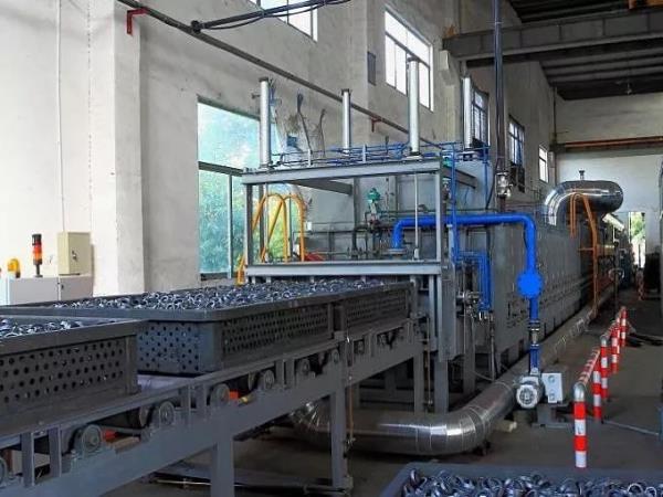 淬回火設(shè)備通常也使用保護氣氛爐型如鑄鏈爐、網(wǎng)帶爐或推桿爐,如圖9b所示,生產(chǎn)效率高、能耗低,常見的國內(nèi)生產(chǎn)廠家有江蘇豐東、北方工業(yè)、杭州金舟等。