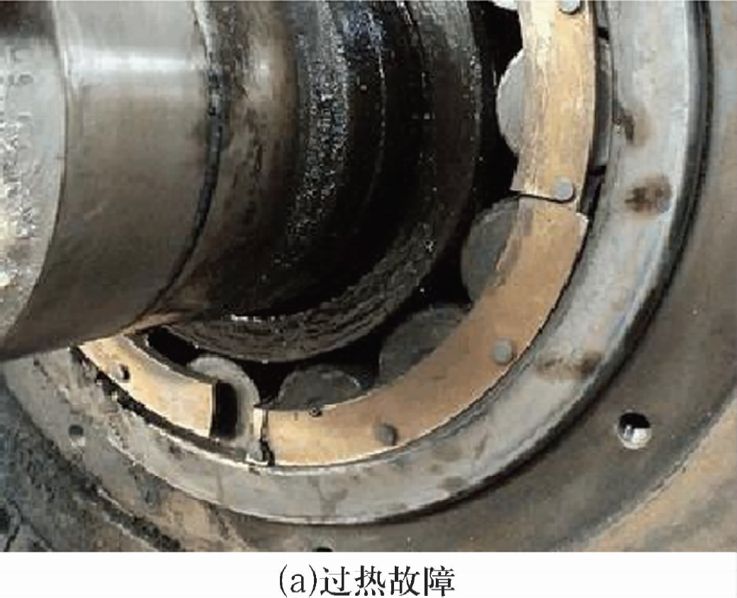 鐵路貨車軸承的故障形式主要有2類:1)由于軸承受擠壓以及摩擦載荷的周期性作用,滾道表層下方的組織出現(xiàn)疲勞并產(chǎn)生細(xì)微裂紋,隨著微裂紋的逐漸擴(kuò)展最終產(chǎn)生由內(nèi)而外的剝落;2)由于密封不良和潤滑劣化導(dǎo)致的過熱故障(圖9),約占總故障的72%,這是導(dǎo)致鐵路貨車軸承實(shí)際使用壽命縮短的關(guān)鍵原因,故障加劇時(shí)甚至?xí)l(fā)切軸等重大事故。