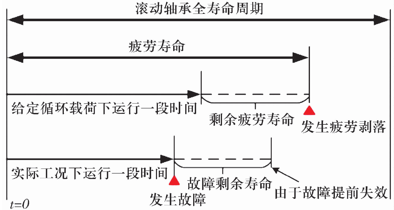 2)剩余疲勞壽命,指軸承在給定循環(huán)載荷條件下累積運(yùn)行一段時(shí)間后繼續(xù)在該條件下運(yùn)行到剝落的時(shí)間;