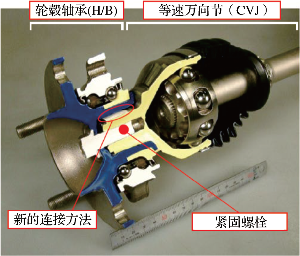 為此,NTN 開(kāi)發(fā)了一種新的CVJ和輪轂軸承單元的裝配方法,可在不改變汽車(chē)廠家的現(xiàn)有裝配線(xiàn)下進(jìn)行。壓接輪轂萬(wàn)向節(jié)(PCS H/J)的方法實(shí)現(xiàn)了質(zhì)量的顯著減輕(圖1)。