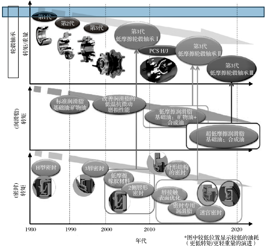 降低輪轂軸承單元的轉(zhuǎn)矩一直是提高車(chē)輛燃油效率的要求,但因?yàn)樵S多國(guó)家出臺(tái)了環(huán)境法規(guī),要求變得越來(lái)越嚴(yán)格。NTN開(kāi)發(fā)了各種低轉(zhuǎn)矩產(chǎn)品,以應(yīng)對(duì)輪轂軸承應(yīng)用的市場(chǎng)需求。輪轂軸承降低轉(zhuǎn)矩的發(fā)展歷程如圖3所示。