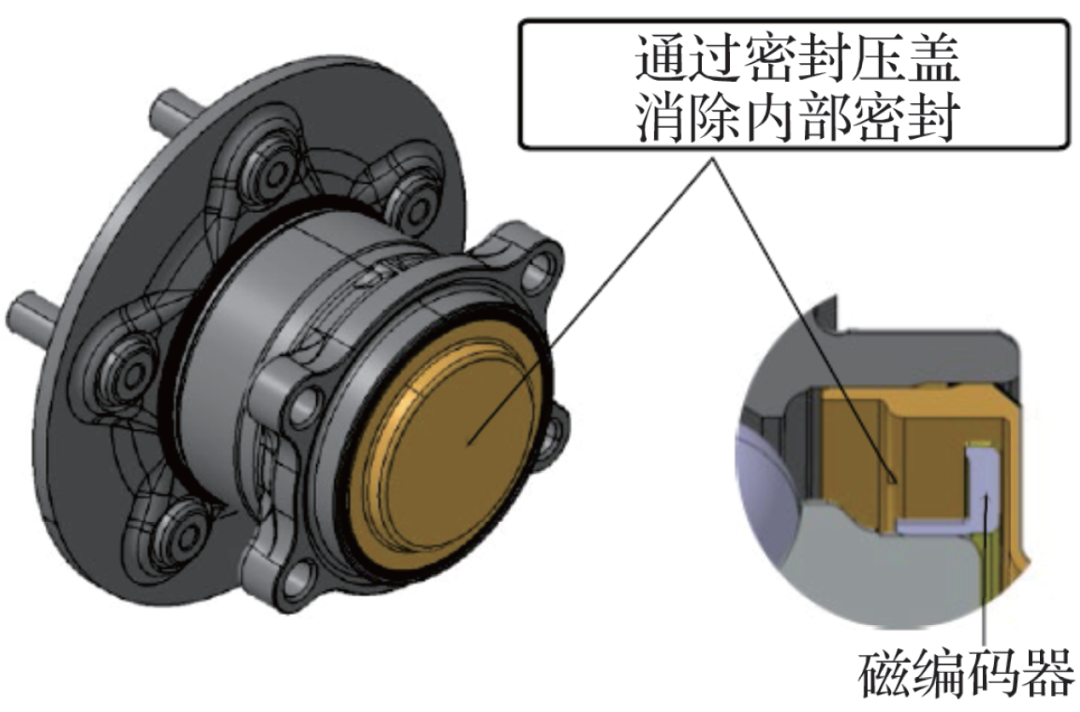對(duì)于驅(qū)動(dòng)輪,CVJ不必嵌入到內(nèi)徑。因此,如圖4所示,采用一種壓蓋密封內(nèi)側(cè)(車(chē)輛側(cè))的設(shè)計(jì),消除了常規(guī)裝置的2個(gè)密封中的1個(gè),從而顯著降低了轉(zhuǎn)矩。