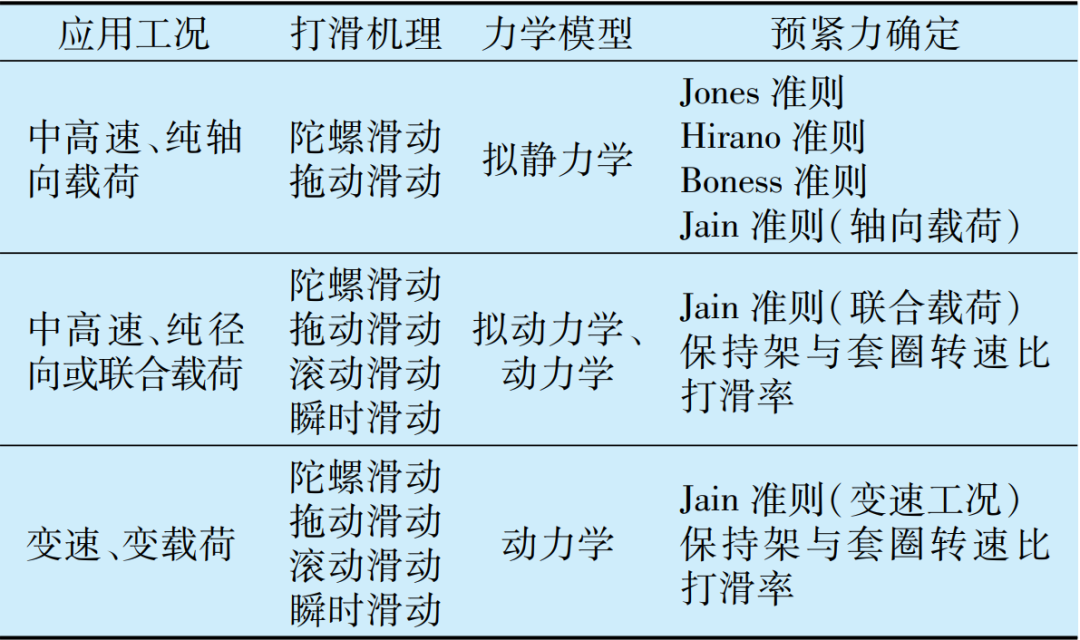 工程實際中預(yù)防軸承打滑最常用的方式是施加預(yù)緊力。對軸承施加合適的預(yù)緊力,一方面可防止軸承打滑,降低摩擦發(fā)熱和磨損,提高軸承使用壽命;另一方面,軸承預(yù)緊力影響轉(zhuǎn)子系統(tǒng)的支承剛度和固有頻率,從而影響軸承–轉(zhuǎn)子系統(tǒng)的動力學(xué)響應(yīng)。針對不同應(yīng)用工況,表1總結(jié)了以防止球軸承打滑為目標(biāo)的最小預(yù)緊力的確定方法。