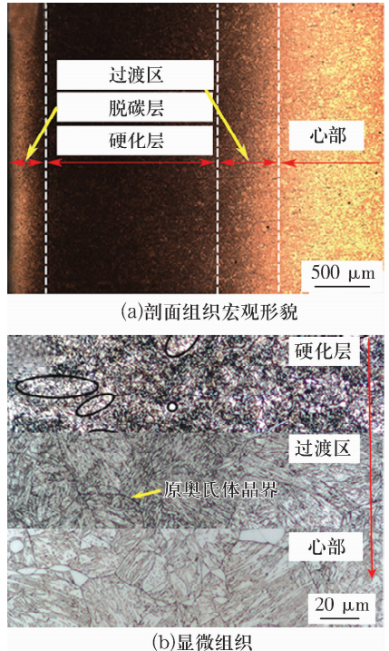滲碳軸承鋼由表層向心部碳含量逐漸降低,熱處理后表層不同深度處的組織存在差異,淬火后滲碳軸承鋼從表面到心部的基體組織依次為: