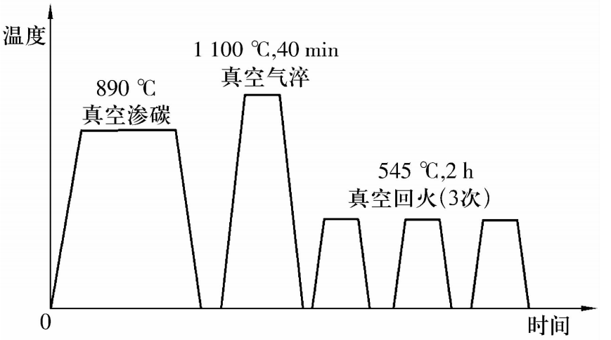 殲–20戰(zhàn)斗機和C919大飛機的先后問世代表了我國航空工業(yè)的崛起,而飛機機動性的每一次提升主要依靠發(fā)動機推重比的增加,如今發(fā)動機主軸dn值已經(jīng)達到2.4×106 mm·r·min-1,發(fā)動機主軸軸承的工作溫度逼近300 ℃,且長期承受巨大的沖擊載荷和循環(huán)疲勞應力。為適應航空軸承更高的性能要求,我國研發(fā)了第2代高溫滲碳軸承鋼G13Cr4Mo4Ni4V(ASTM M50NiL)。根據(jù)YB/T 4106——2000《航空發(fā)動機用高溫滲碳軸承鋼》規(guī)定,其經(jīng)過滲碳、淬火和回火處理后的表層硬度可達到62~63 HRC,具有較高的耐磨性和良好的抗疲勞性能,心部板條馬氏體提供了良好的沖擊韌性。圖7所示為G13Cr4Mo4Ni4V鋼常用的滲碳熱處理工藝,真空滲碳時的溫度一般為890 ℃,然后經(jīng)1 100 ℃淬火,再545 ℃回火處理3次,每次2 h。