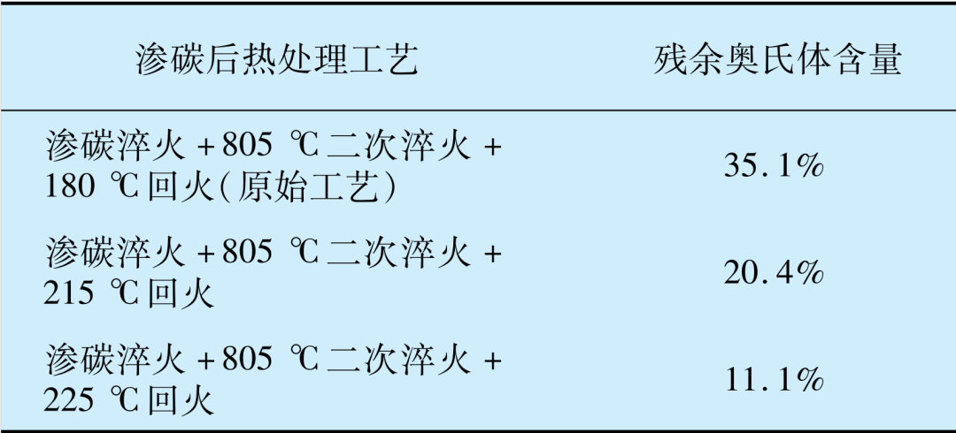 表2 G20CrNi2Mo 鋼不同滲碳熱處理后內(nèi)圈滾道的殘余奧氏體含量