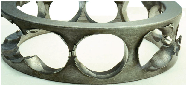 磨粒磨損(顆粒磨損;三體磨損)是存在硬顆粒時(shí)由于滑動(dòng)產(chǎn)生的材料移失,當(dāng)一硬的表面或顆?;^(guò)另一表面時(shí),通過(guò)切削或犁溝作用而從該表面移除材料。磨損后表面會(huì)發(fā)生某種程度的變暗,磨粒的粗細(xì)和特性不同,變暗程度不同(圖2)。由于旋轉(zhuǎn)表面,可能還有保持架(圖3)上的材料被磨掉,磨粒數(shù)量逐漸增多,最終磨損進(jìn)入一個(gè)加速過(guò)程,從而導(dǎo)致軸承失效。