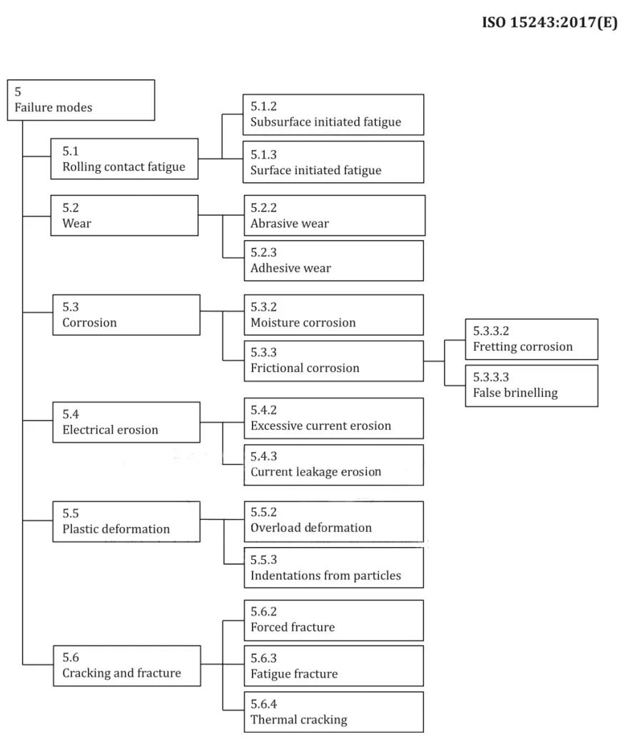 軸承失效最好按照其失效的根本原因進(jìn)行分類(lèi),但未必總是能夠很容易地將原因與特征(癥狀)或者失效機(jī)理與失效模式一一對(duì)應(yīng),大量相關(guān)的文獻(xiàn)也都證實(shí)了這一點(diǎn)(見(jiàn)參考文獻(xiàn))。基于使用中可見(jiàn)的明顯特征外觀,GB/T 24611—2020/ISO 15243 :2017將失效模式分為六大類(lèi)和不同的小類(lèi)(圖1)。