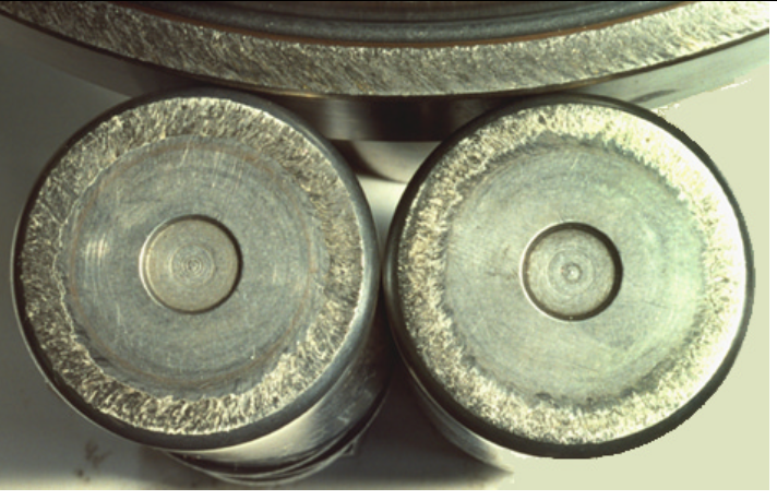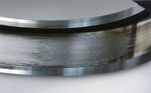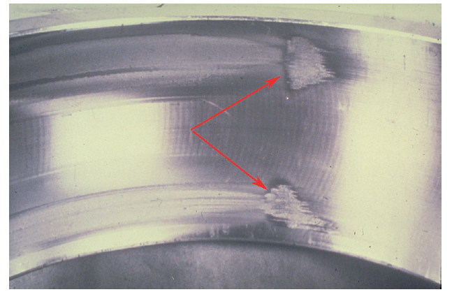 發(fā)生蠕動(dòng)時(shí),套圈和支承面接觸區(qū)內(nèi)的粗糙峰被滾碾,使套圈表面呈現(xiàn)光亮外觀。在蠕動(dòng)過(guò)程中滾碾經(jīng)常發(fā)生,但不總是伴有套圈和支承面接觸處的滑動(dòng),因而還可看到其他損傷,如擦傷印痕、微動(dòng)磨蝕和磨損。在某些承載條件下,當(dāng)套圈和支承面之間的過(guò)盈量不夠大時(shí),則以微動(dòng)磨蝕為主。