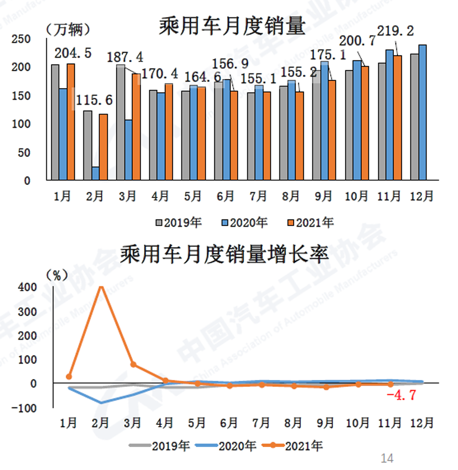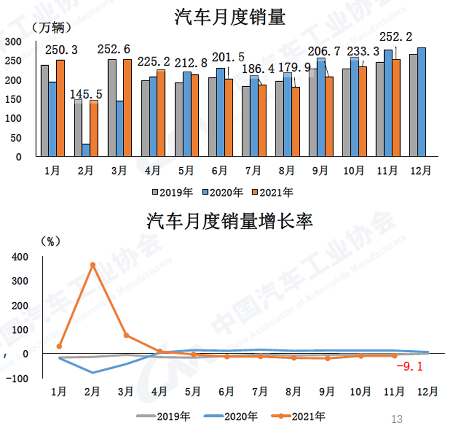 中國汽車工業(yè)協(xié)會最新數(shù)據(jù)顯示,2021年11月,汽車產(chǎn)銷環(huán)比延續(xù)了增長勢頭,同比依然下降。9月以來月度產(chǎn)銷環(huán)比持續(xù)增長,汽車市場總體呈現(xiàn)一定回暖跡象,預(yù)計12月產(chǎn)銷有望延續(xù)環(huán)比增長勢頭,全年產(chǎn)銷將超過2600萬輛,同比小幅增長,其中新能源汽車全年產(chǎn)銷有望雙雙超過340萬輛。