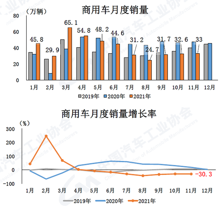 11月,商用車產(chǎn)銷35.3萬輛和33萬輛,環(huán)比增長3.2%和1.1%,同比下降31.9%和30.3%。在商用車主要品種中,與上月相比,貨車和客車產(chǎn)銷均呈增長;與上年同期相比,貨車和客車產(chǎn)銷均呈較快下降。