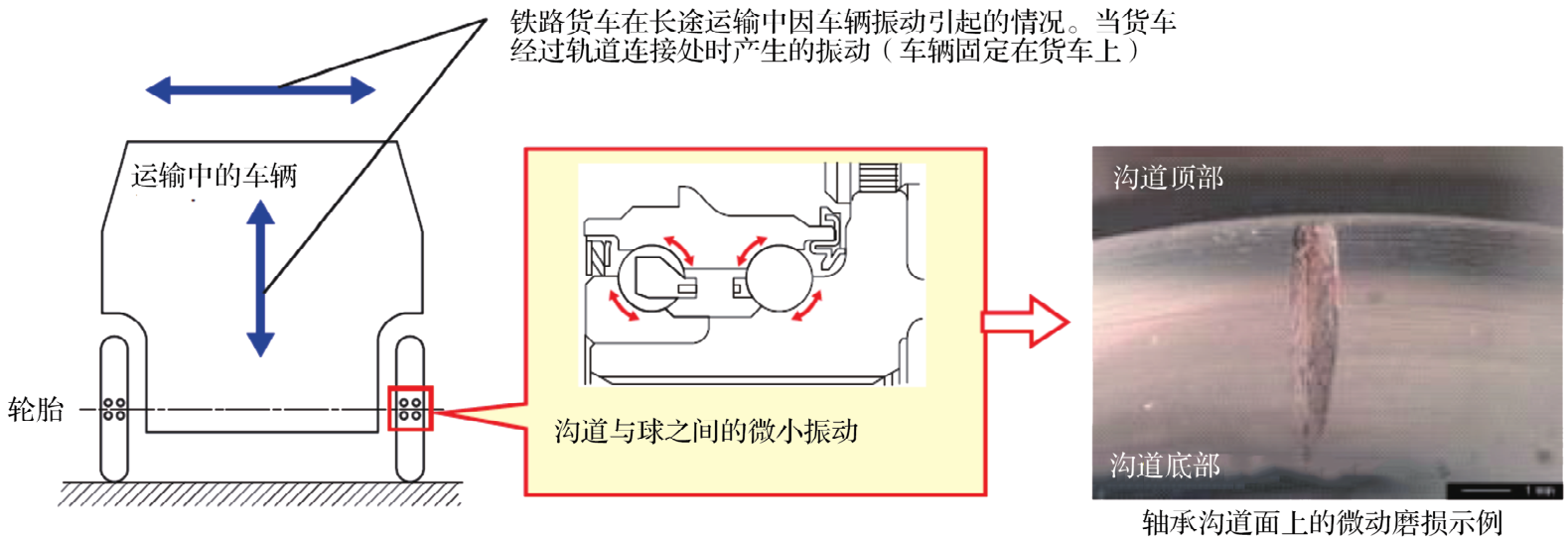 新制造的車輛在鐵路貨車上進(jìn)行長途運(yùn)輸時,輪轂軸承的溝道與球之間會產(chǎn)生微小振動。如圖4中的箭頭所示,振動會擠壓出溝道與球之間的潤滑脂,產(chǎn)生金屬與金屬接觸,導(dǎo)致微動磨損。在潤滑脂趨于變硬和流動性降低的低溫條件下,微動磨損更明顯。在這種情況下駕駛車輛可能會產(chǎn)生異常聲。